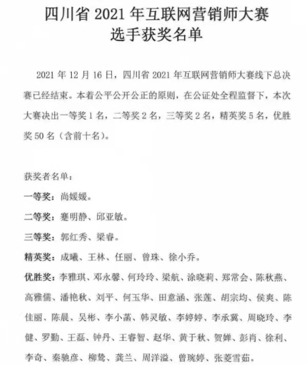 四川省2021年互联网营销师大赛选手获奖名单