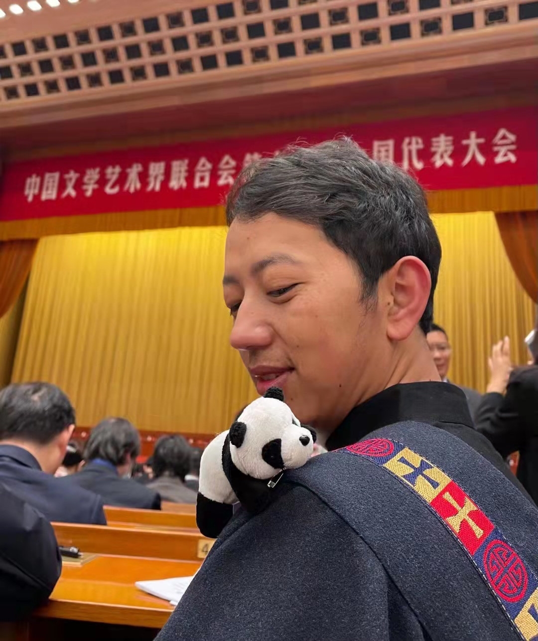 大会期间,四川团代表通过方言诗《我们的心声》表达四川代表团参与大会的心情心声,同时还集体在肩上“戴”上萌宠可爱的熊猫,展示四川的热情友好,独特的四川元素,成为文代会上一道别致的风景线。