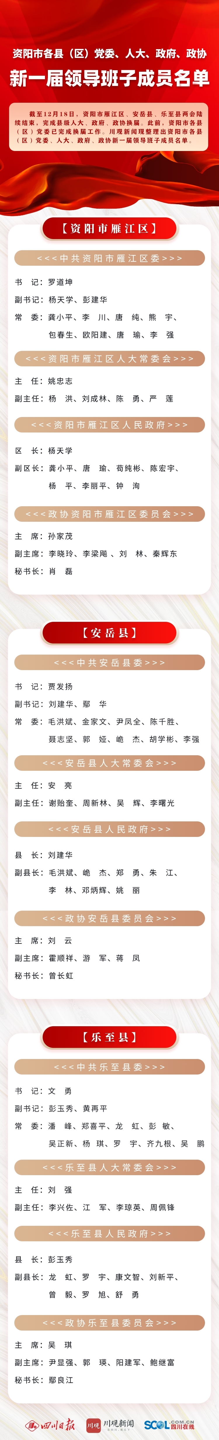 截至12月18日,资阳市雁江区、安岳县、乐至县两会陆续结束,完成县级人大、政府、政协换届。此前,资阳市各县(区)党委已完成换届工作。四川在线现整理出资阳市各县(区)党委、人大、政府、政协新一届领导班子成员名单。