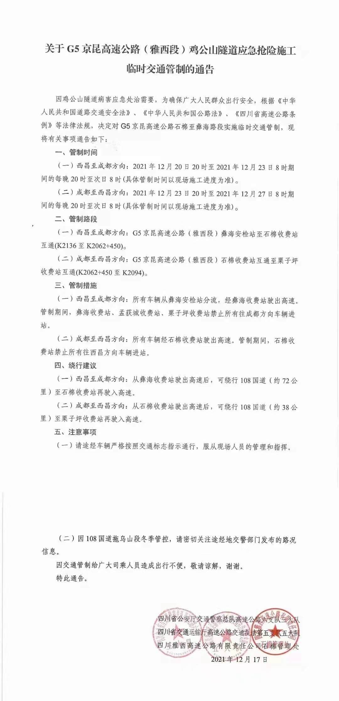 12月18日,据四川省公安厅交通警察总队高速公路六支队消息,因鸡公山隧道病害应急处治需要,决定对G5京昆高速公路石棉至彝海路段实施临时交通管制。