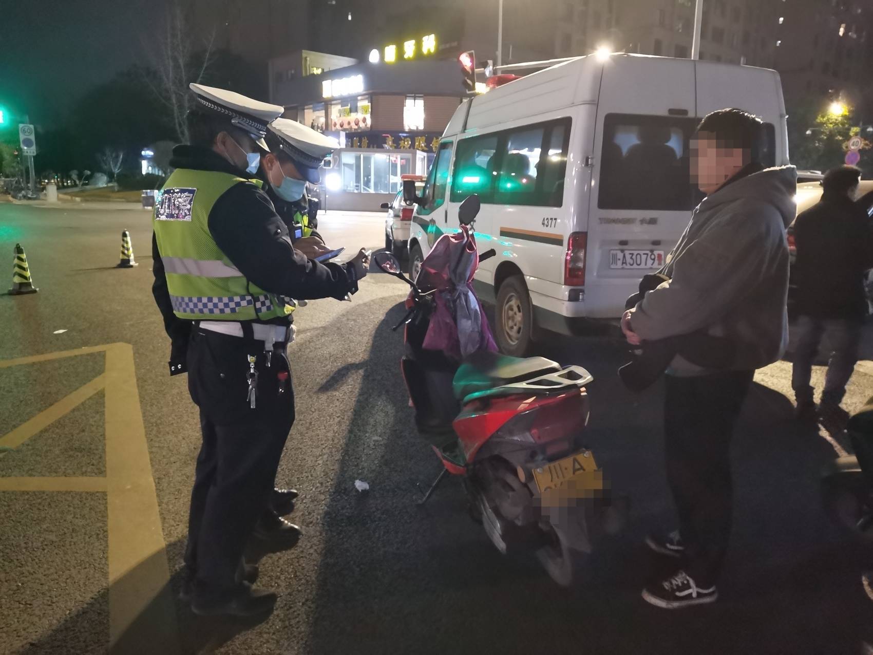 21时26分,执勤民警在高新南区天府大道北段查获川A5***9的普通二轮摩托车,经现场检查,该车辆违法加装射灯和实施机动车违反禁令标志指示的违法行为,民警依法对驾驶人侯某进行处罚,责令将车辆恢复原状。