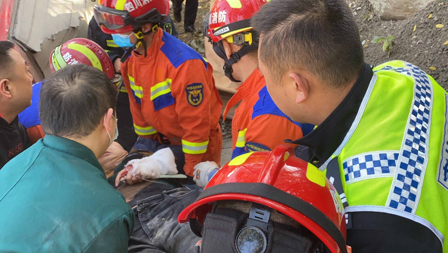 现场指挥员迅速指定救援方案,对驾驶室进行破拆,7时56分,医护人员到达现场。10时36分,在消防指战员和民警的共同配合下,成功将被困人员从驾驶室安全救出,交由医护人员处置。
