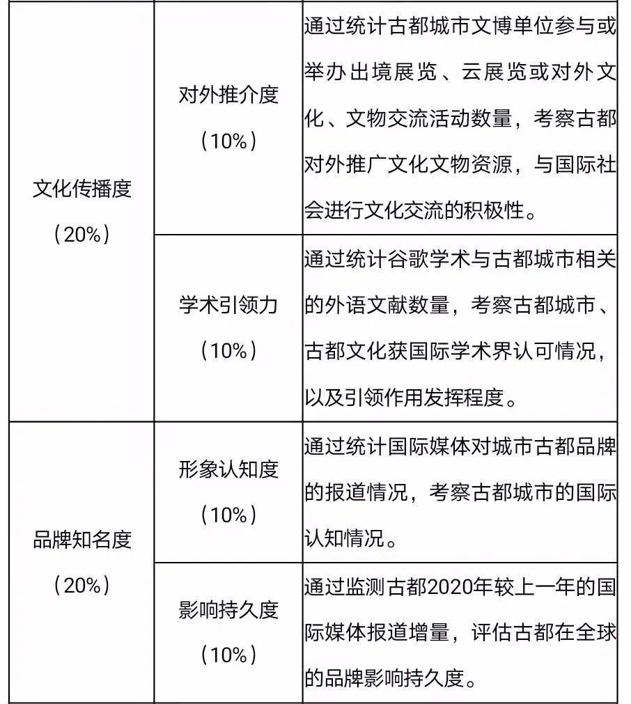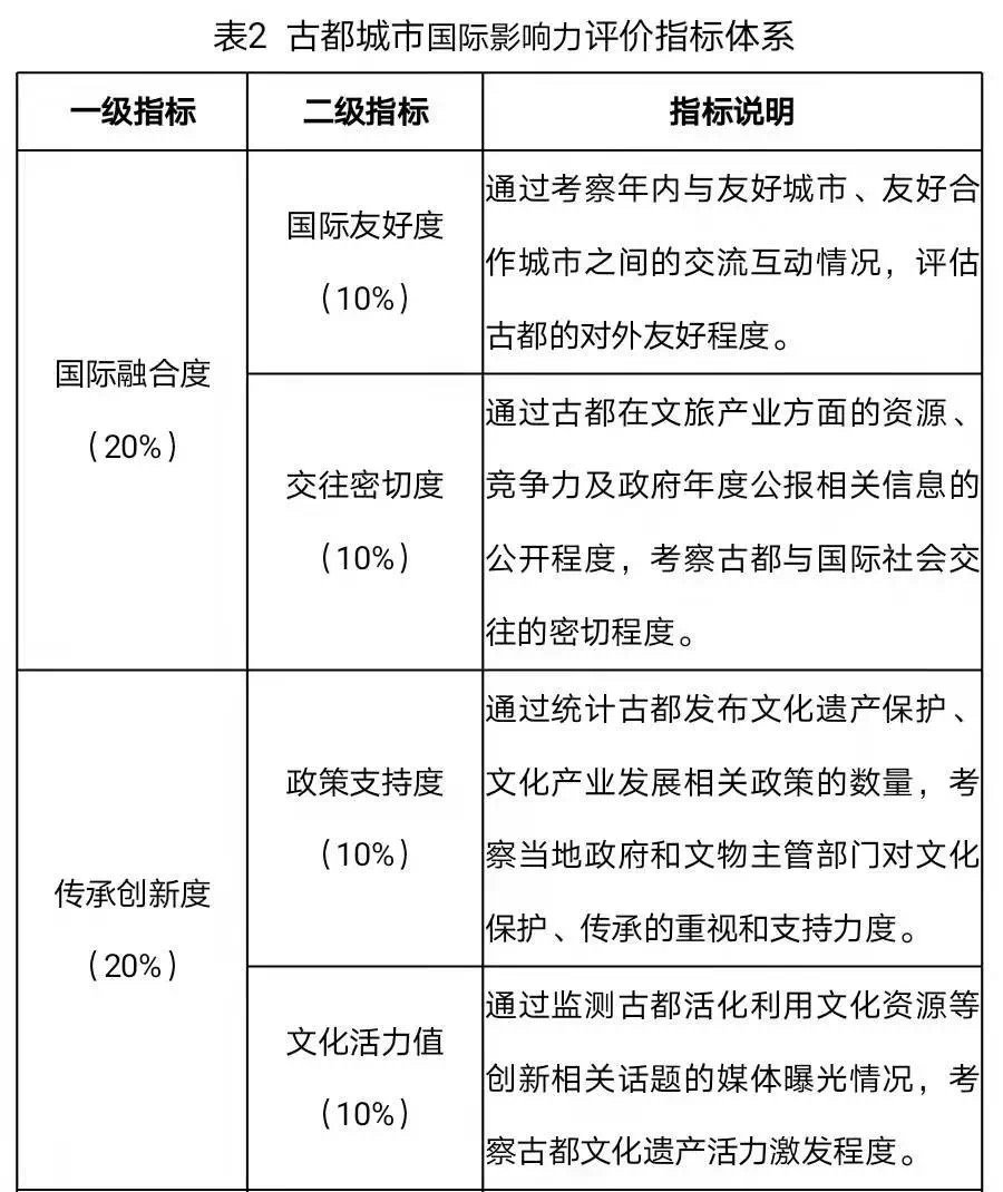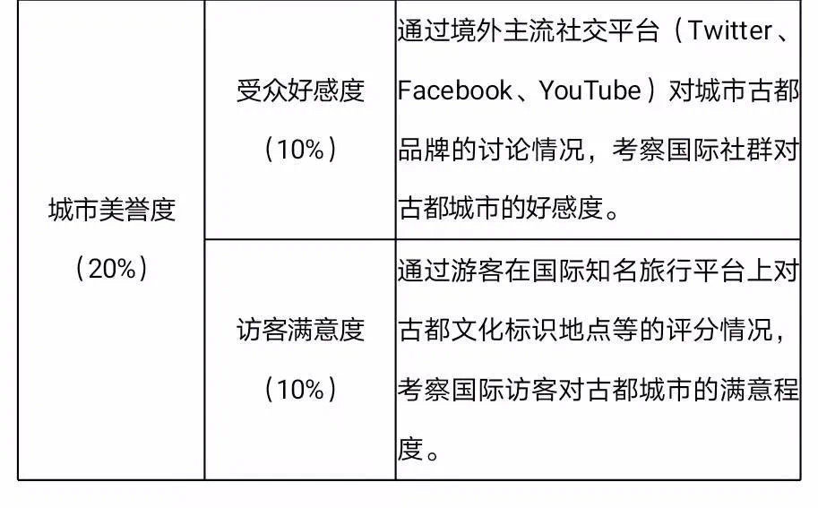 本报告主要从国际融合度、传承创新度、文化传播度、品牌知名度、城市声誉度等维度对古都城市进行监测评估,探索构建古都城市国际影响力评价指标体系,形成了由5个一级指标和10个二级指标构成的评价指标体系,报告中综合指标的计算采用线性加权综合评价模型,即对各指标进行线性加权求和,从而得到综合评价指数。