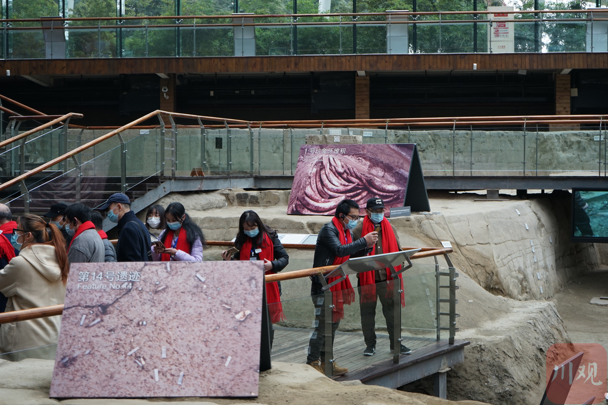在讲解员带领下,诗人们步入展厅,首先来到金沙遗址祭祀区考古发掘现场,这里是古蜀王国的都邑,考古人员发现了大型建筑基址、祭祀区、一般居住址、大型墓地等众多遗迹,通过考古发掘材料,还原出古蜀人生活的图景。