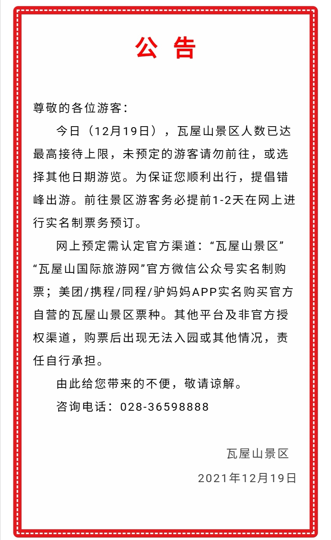 12月19日,记者从瓦屋山景区获悉,当时上午,受景区游客暴增影响,该景区及时发布了公告,倡议游客“非预定门票不上山”。