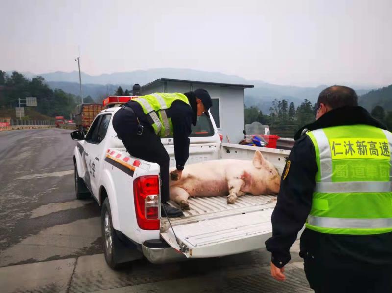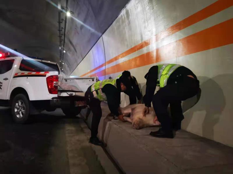 通过监控回放,可以看到14时17分左右,一辆蓝色牌照货车进入隧道时,车辆上层的一头肥猪极不安分,半个身子已经探出了栏板。在隧道内开到一半时,这头猪终于“忍无可忍”,从货厢的二层一跃而下,头朝下落地来了个“脸刹”。待民警赶到现场的时候,这位“二师兄”已经身受重伤无法动弹。而开车的驾驶员直到即将到达目的地时接交警电话,方才知道自己的肥猪“越狱”逃跑。为了快速消除险情,民警和赶来的路安队员一起将几百斤的猪抬到了警车上护送下站,并通知驾驶员过来认领。15时许,现场清撤完毕,道路恢复畅通。