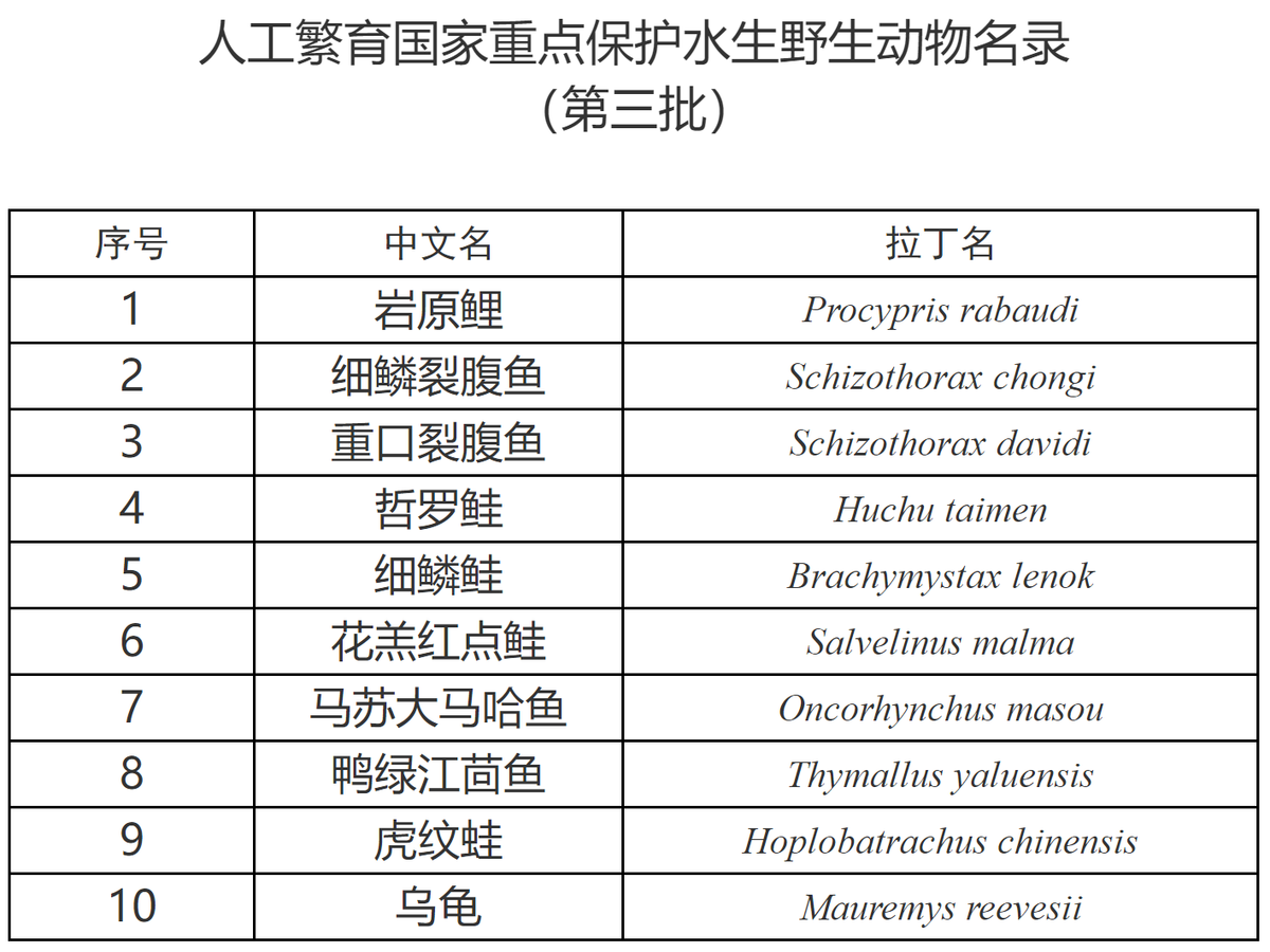 本批次列入农业农村部公布的第三批《人工繁育国家重点保护水生野生动物名录》的野生动物共有10中,包括了哲罗鲑、乌龟等。