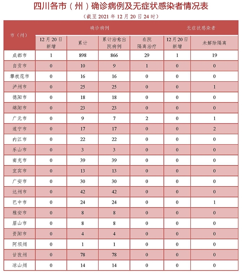 据四川卫健委通报,12月20日0-24时,四川新增新型冠状病毒肺炎确诊病例1例(境外输入,为12月19日无症状感染者转确诊),新增治愈出院病例1例,无新增疑似病例,无新增死亡病例。
