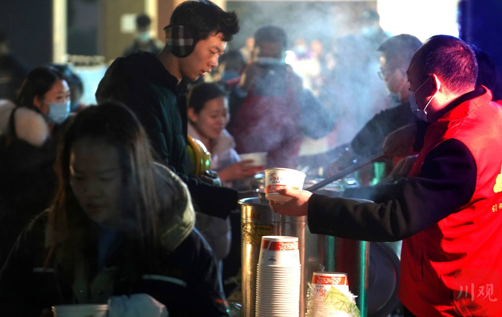清晨5点,天还未亮,300余名来自黄甲街道的党员志愿者、商家志愿者、居民志愿者身穿“红马甲”,联合商家联盟、社区爱心企业、社会组织,将第一锅香气扑鼻的羊肉汤送给来自天南海北相聚于黄甲的3000余名“蓉漂”。天未亮,“暖冬靓汤行”的志愿者们已为黄甲街道双兴社区,清晨刚下夜班的工人送去一碗热腾腾的羊肉汤,让他们在这个冬天暖身又暖心!