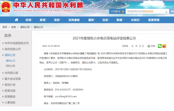 12月21日,记者从水利部官网获悉,经绿色小水电示范电站评定委员会评定,拟推荐吉林省白山市大松树等254座水电站为2021年度绿色小水电示范电站,现予以公示。如有异议,请在公示期内,以实名提出书面意见。