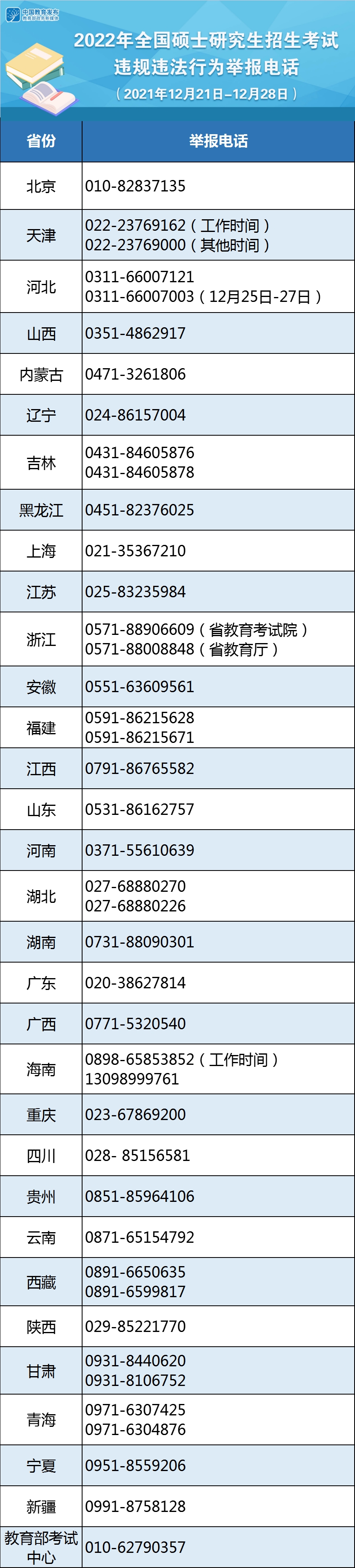 现公布2022年全国硕士研究生招生考试违规违法行为举报电话,欢迎社会各界和广大考生积极参与监督。
