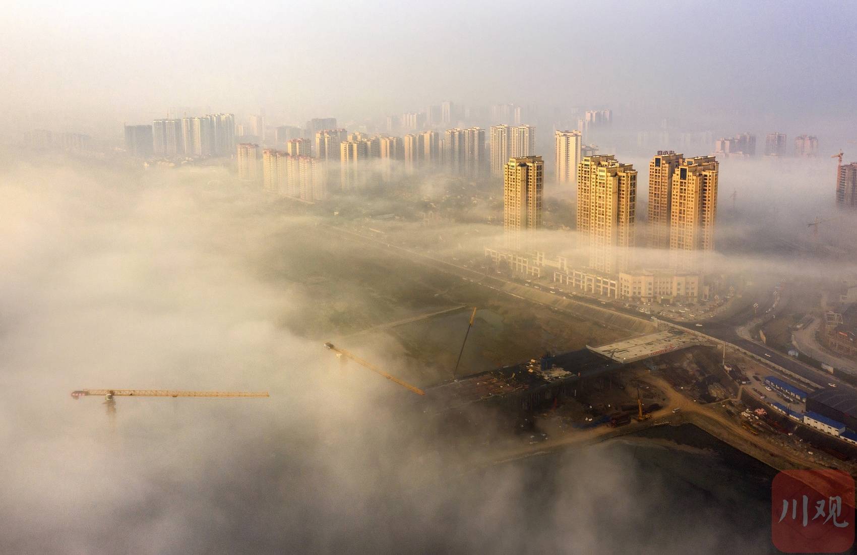 12月21日,在清晨第一缕阳光的照射下,眉山市彭山区焕发出迷人的风采。水汽凝结成白色的云雾,把整个城市装扮的宛若仙境一般,建筑在云雾中若隐若现,美不胜收。