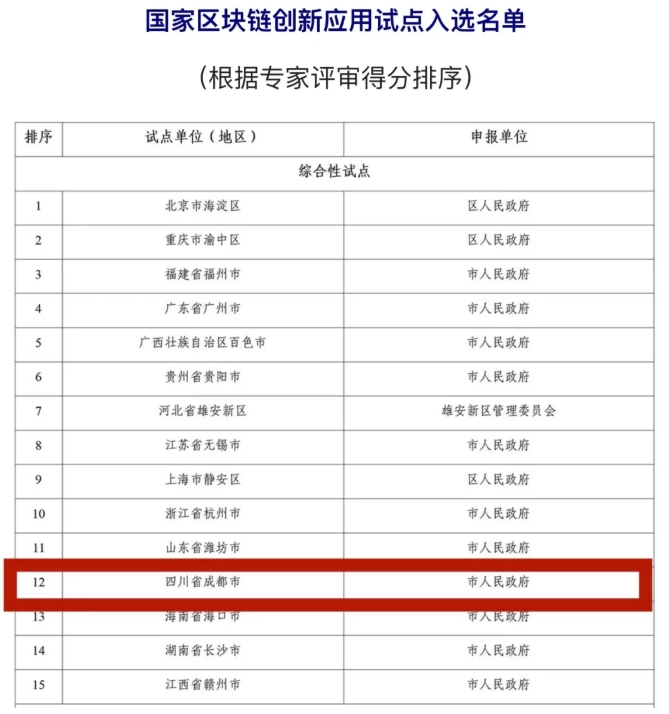 日前,中央网信办、中央宣传部、国务院办公厅电子政务办公室、最高人民法院、最高人民检察院、教育部、工业和信息化部等17个部门和单位公示了国家区块链创新应用试点入选名单。成都市人民政府作为申报单位入选15个综合性试点之一。