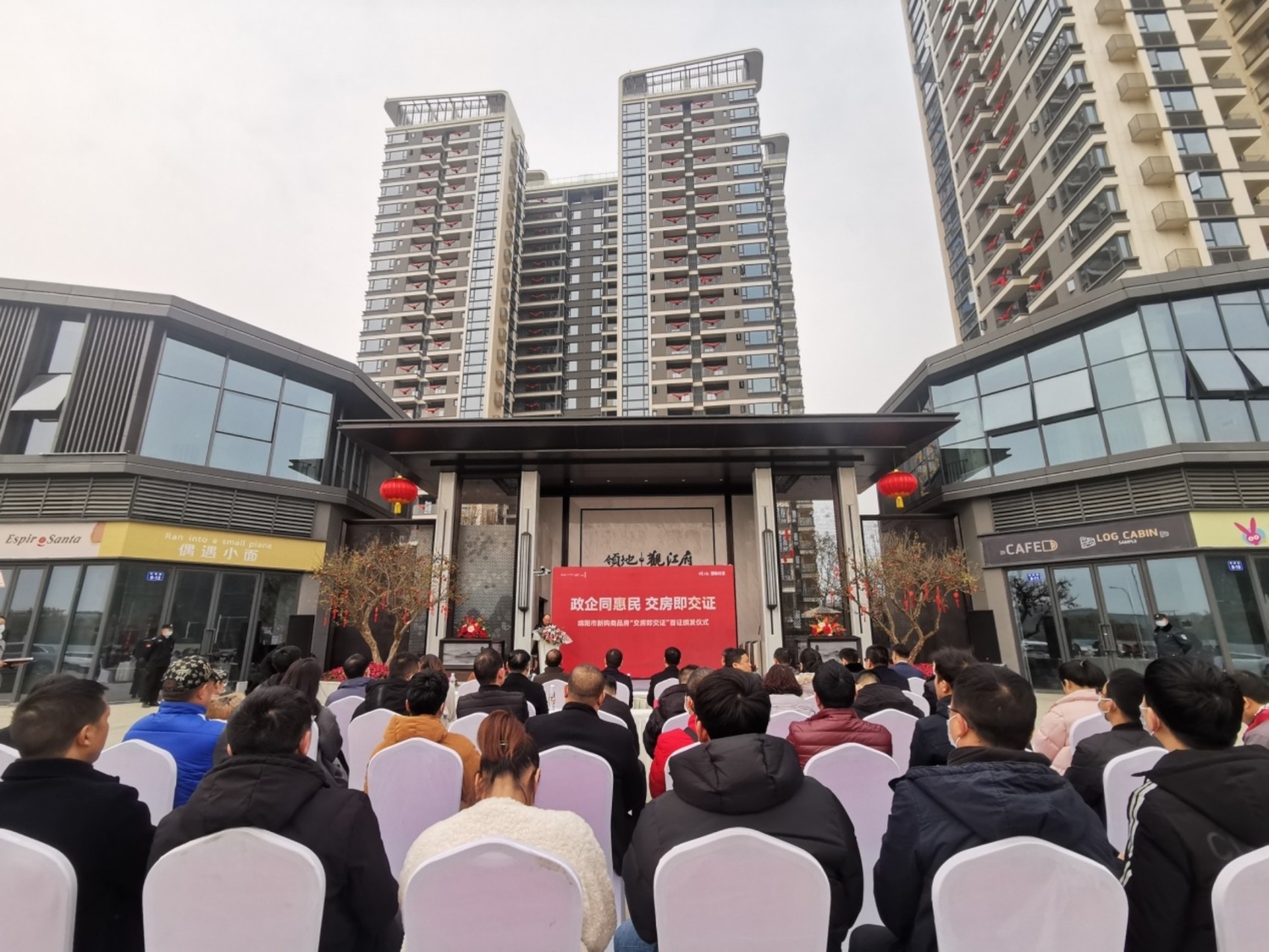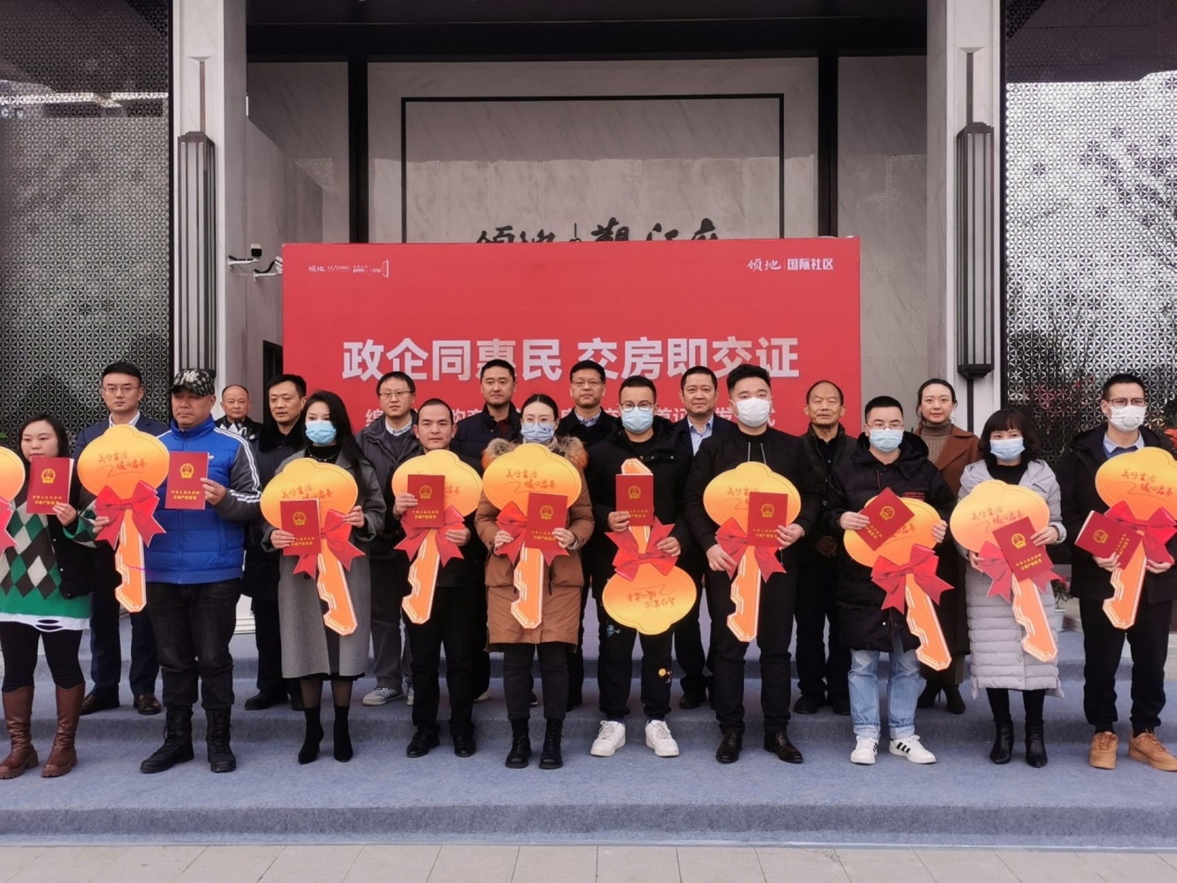 12月22日,在绵阳高新区领地观江府小区正门前,首批11位业主代表一手领到新房钥匙,一手领到了《不动产权证书》,成为绵阳市首批享受“交房即交证”、住权与产权同步服务新举措的购房者。