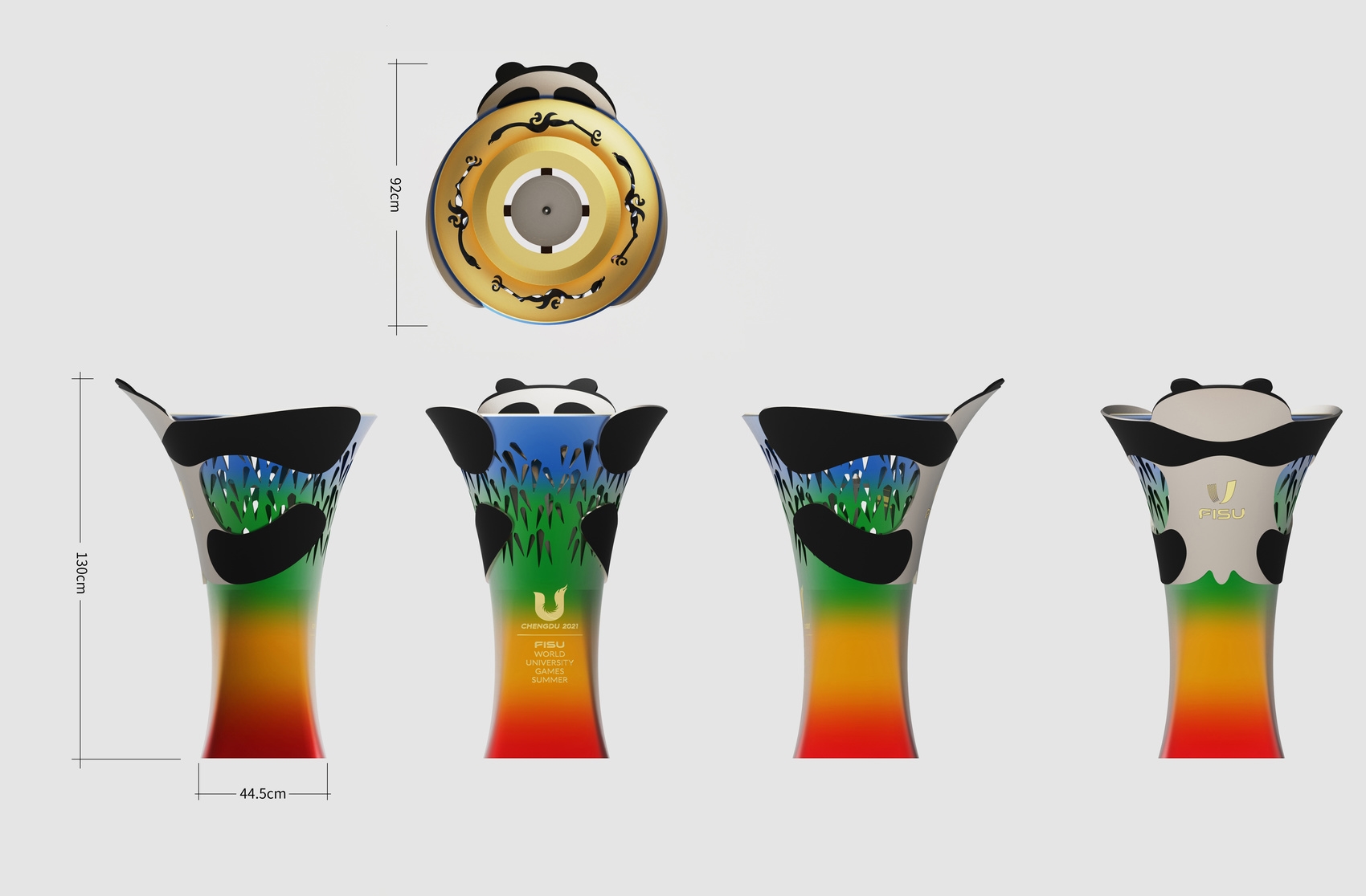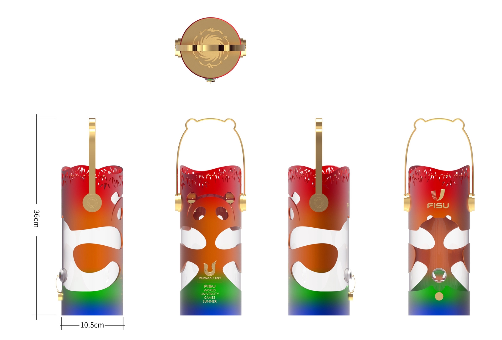 成都大运会火种灯与大运会火炬“蓉火”形成系列,以传统手提式马灯造型与现代耳机形式巧妙结合,仿佛聆听来自全球的祝福。透空的大熊猫和竹叶与炫丽的色彩在虚实之间巧妙融合,整体造型体现了成都和谐与包容的文化内涵。成都大运会火种盆的创意则取自于中国传统文化中“樽”的形象,天圆地方的造型大气恢宏,通过樽的意象传达诚挚之邀,可爱活泼的国宝大熊猫张开双臂做拥抱状,拥抱来自全世界的运动健儿,拥抱希望,拥抱美好未来。