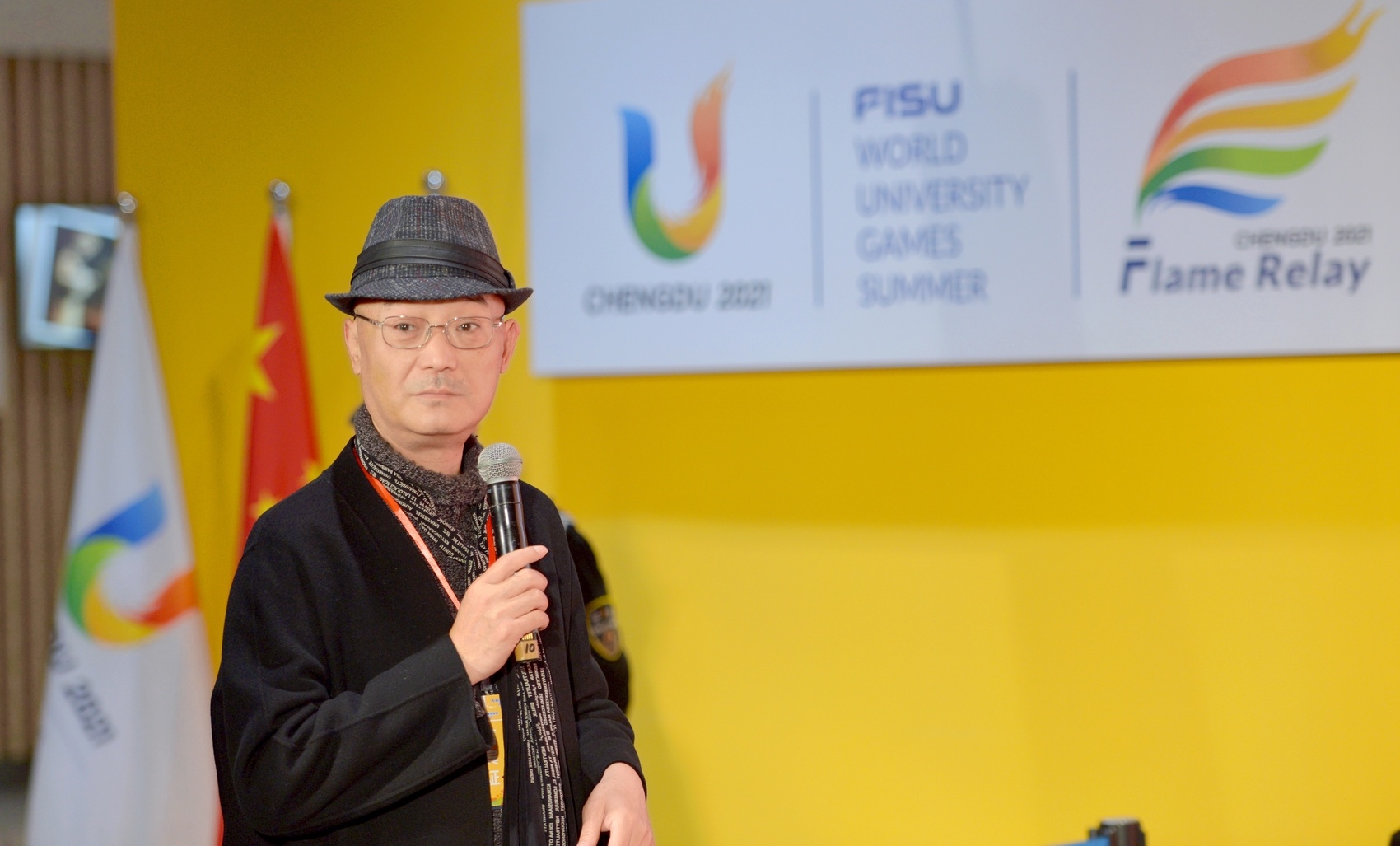 艺术设计家许燎源在活动现场向来宾介绍成都大运会火种灯、火种盆