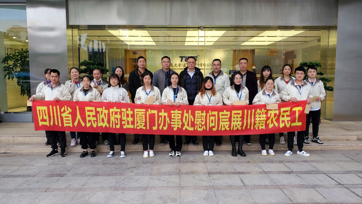走访慰问小组先后深入厦门鑫创辉工贸有限公司、福建省康嘉建筑工程有限公司、宸展光电(厦门)股份有限公司等企业,慰问在这里工作的川籍农民工,并为工作优秀家庭困难的川籍农民工代表发放慰问金。