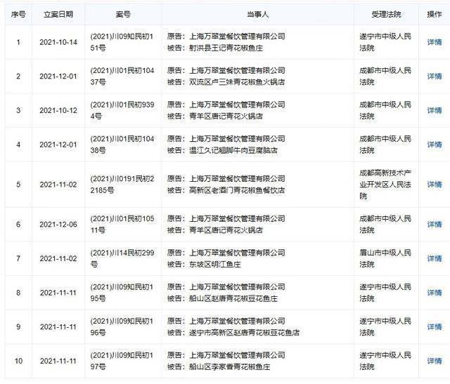 起诉这些四川餐馆的,是“上海万翠堂餐饮管理有限公司”,其在2021年11月、12月,起诉了数十家四川的餐馆。