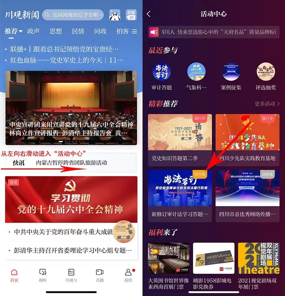 (二)从左向右滑动进入活动中心,找到相应区域,参与答题。