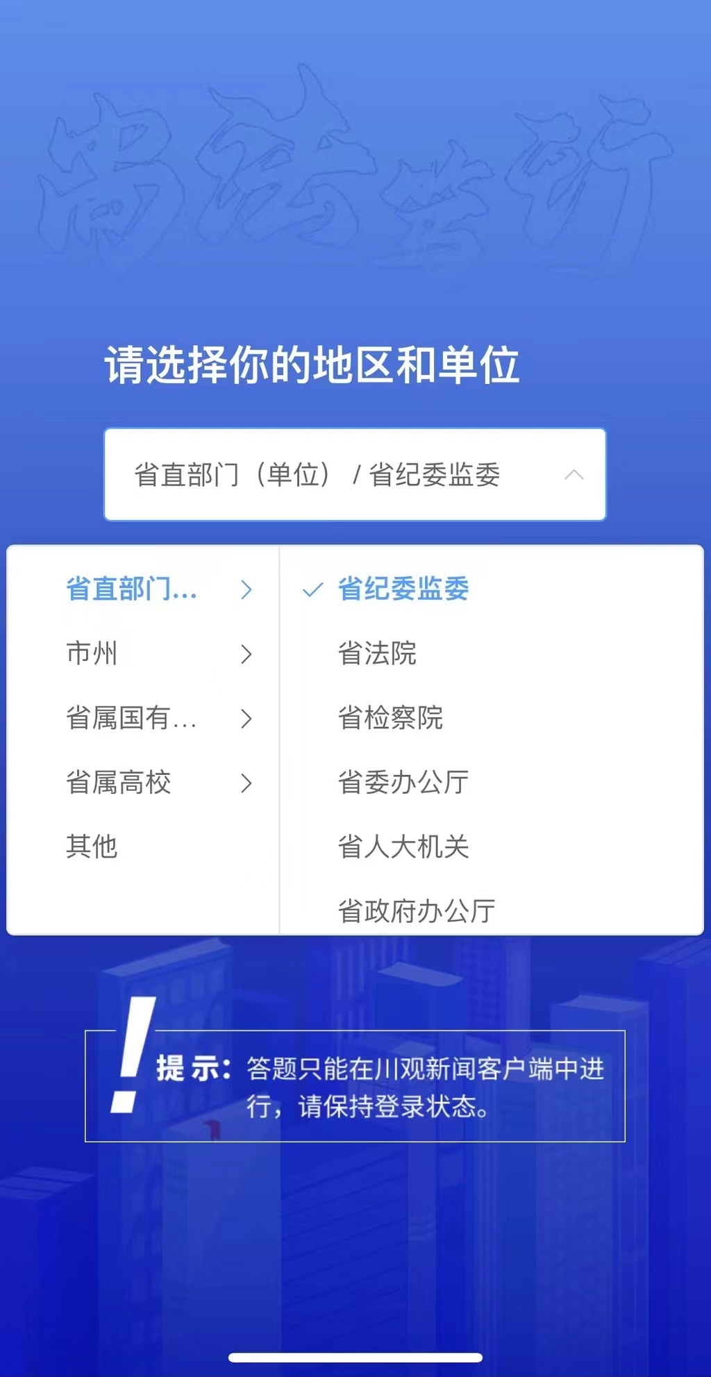 ● 第三步:在活动页面选择所在的单位或市(州)。省直部门(单位)、省属国有企业、省属高校参赛人员请在对应的菜单中选择所属单位;各市(州)及区(市、县)党政机关、国有企事业单位参赛人员请选择所在的市(州);其他参赛人员请选择“其他”选项。