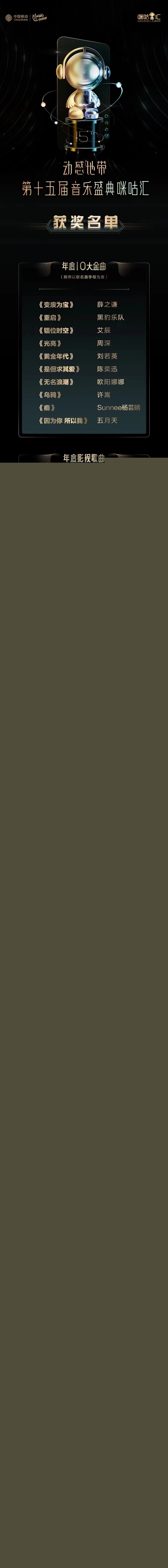 12月25日晚,致敬热爱——动感地带・第十五届音乐盛典咪咕汇盛大举办。作为华语地区首个以客观数据为基础的音乐颁奖盛典,本届咪咕汇现场汇聚G.E.M.邓紫棋、黑豹乐队、李宇春、马栗、欧阳娜娜、小鬼-王琳凯、五月天、谢春花、许嵩、薛之谦、Sunnee杨芸晴、周杰伦、周深等实力音乐人,30多个专业奖项重磅颁发,乐迷们通过咪咕音乐、咪咕视频、咪咕爱唱、咪视通、移动云VR、魔百盒、中国移动5G FUN映厅等平台直播全程见证,再燃华语乐坛十五载高光记忆,共赴年度狂欢。