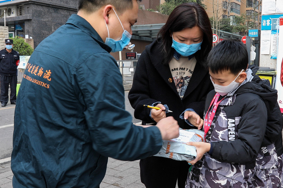 2020年3月7日上午,邮递员涂礼志把教材送到学生丁文翰家小区。