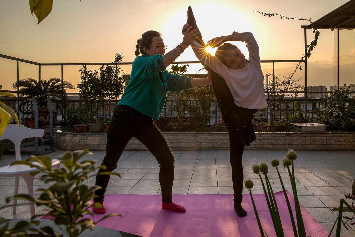 2020年3月19日,成都双语实验学校五年级4班杨雅雯在母亲的协助下在家屋顶花园练习舞蹈。