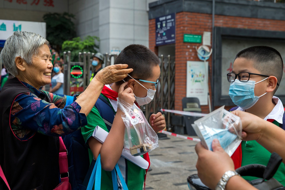 2021年9月1日,新学期开学日家长为准备入校的学生戴口罩。