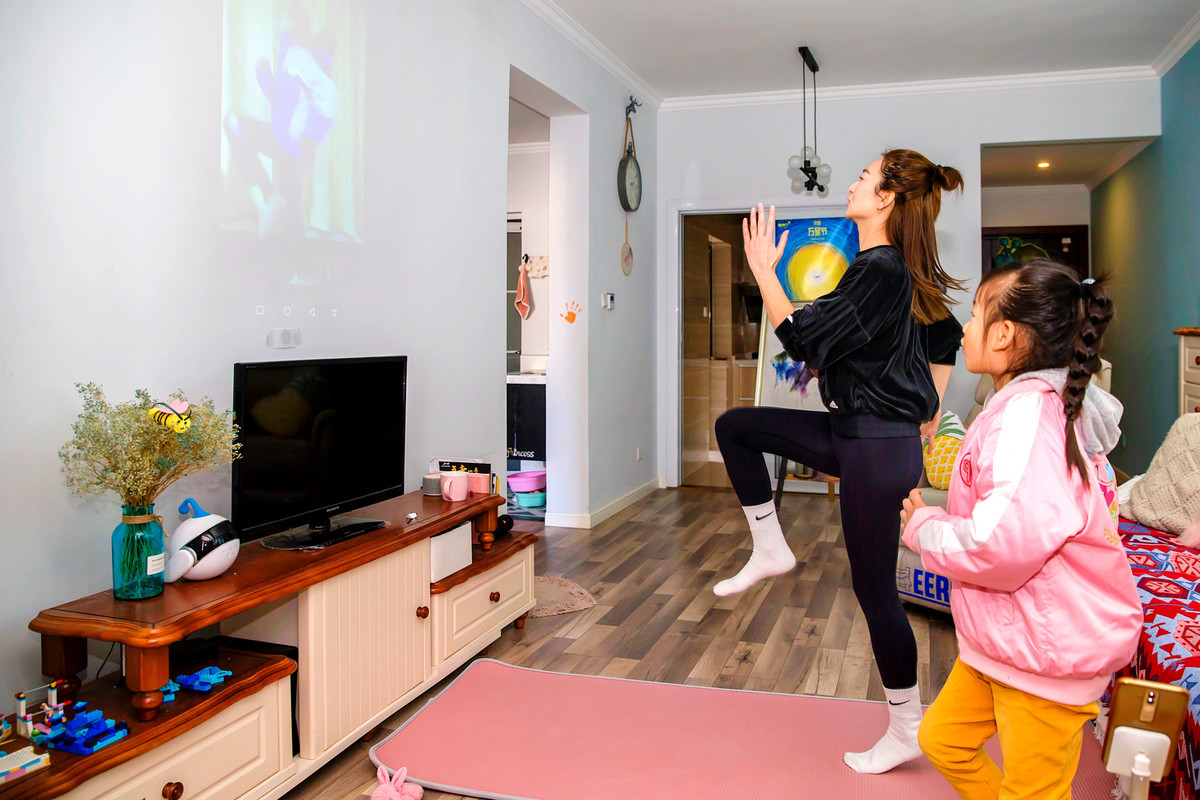 2020年3月17日,成华区跳蹬河南路某小区成都双语实验学校体育老师石红在家为学生上体育课。
