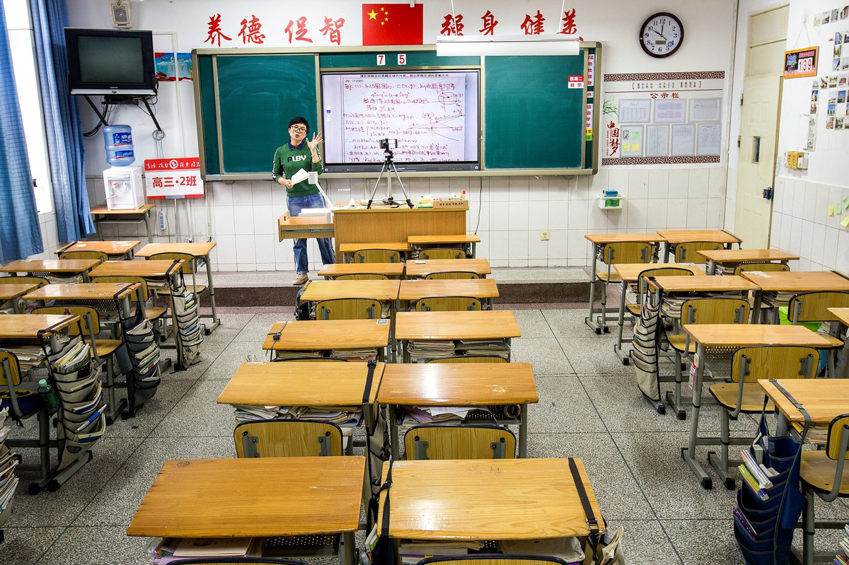 2020年3月19日,成都市第36中学校数学老师曾艳在高三2班空空的教室上网课。