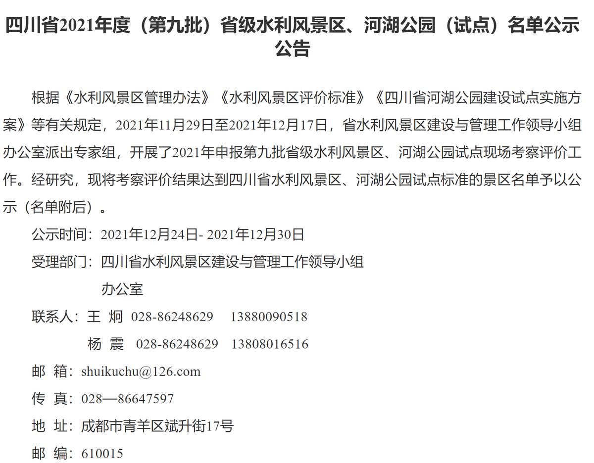 根据《水利风景区管理办法》《水利风景区评价标准》《四川省河湖公园建设试点实施方案》等有关规定,今年11月29日至12月17日,四川省水利风景区建设与管理工作领导小组办公室派出专家组,开展了2021年申报第九批省级水利风景区、河湖公园试点现场考察评价工作,四川省水利风景区、河湖公园试点标准的景区名单正在公示,公示时间为12月24日—12月30日。