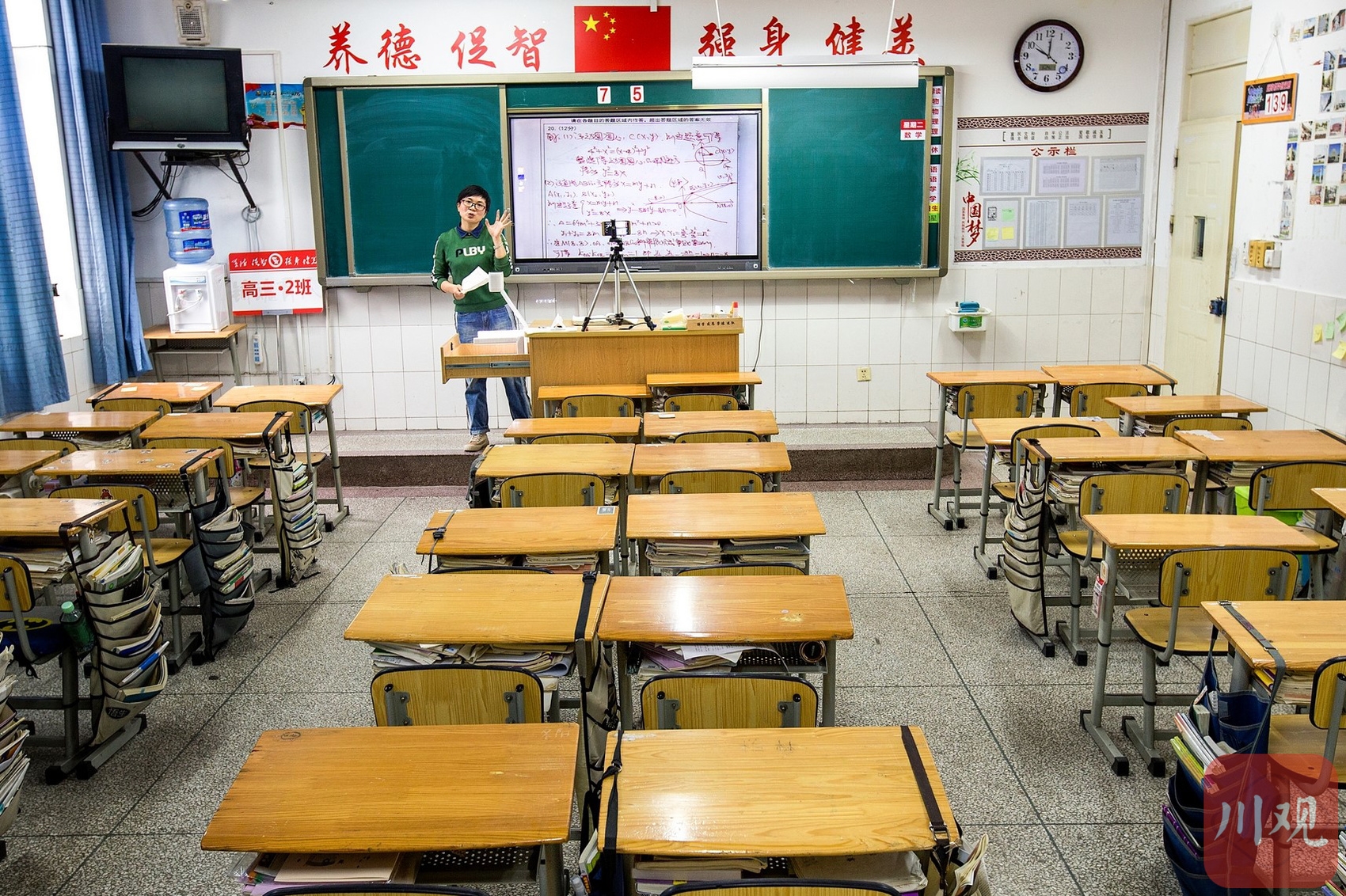 2020年3月19日,成都市第36中学校数学老师曾艳在高三2班空空的教室上网课。
