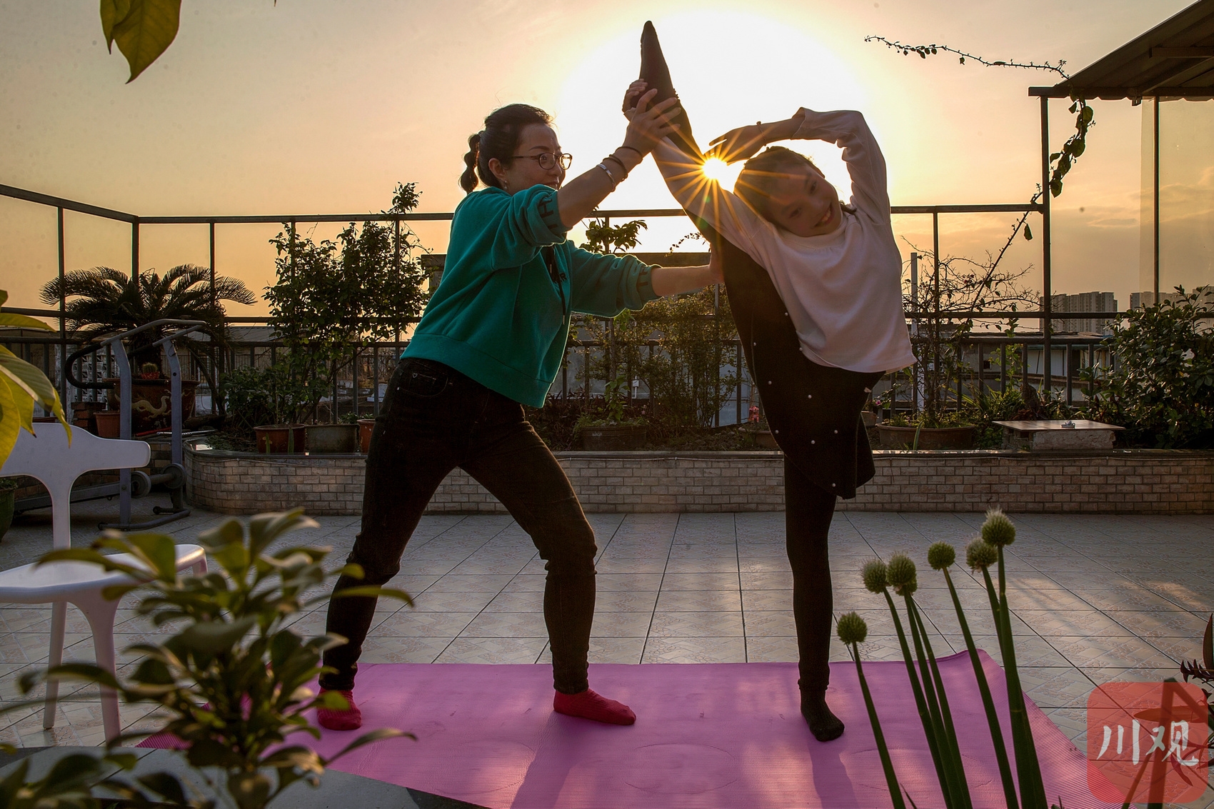 2020年3月19日,成都双语实验学校五年级4班杨雅雯在母亲的协助下在家屋顶花园练习舞蹈。