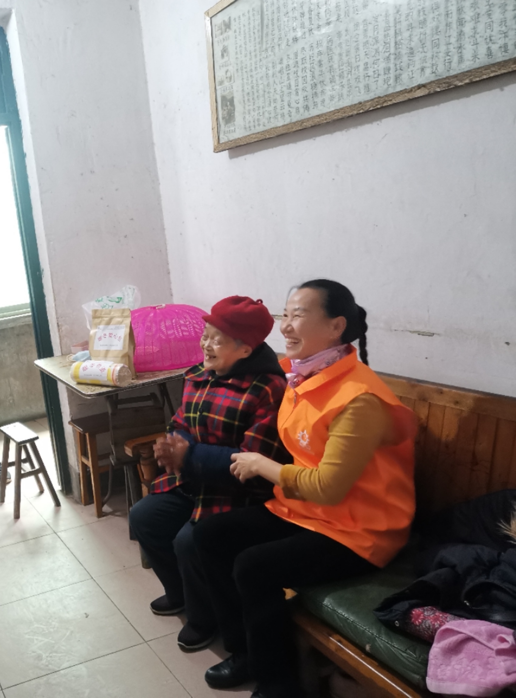 当天,社工站组织老年志愿者队伍来到熊朝珍老人的家,为她和老伴表演了腰鼓、辣妹子歌舞等节目,还帮助两位老人剪指甲,陪他们聊天。两位老人直呼党的政策好。