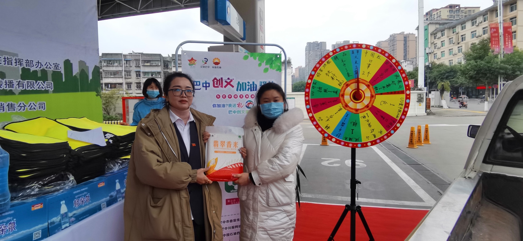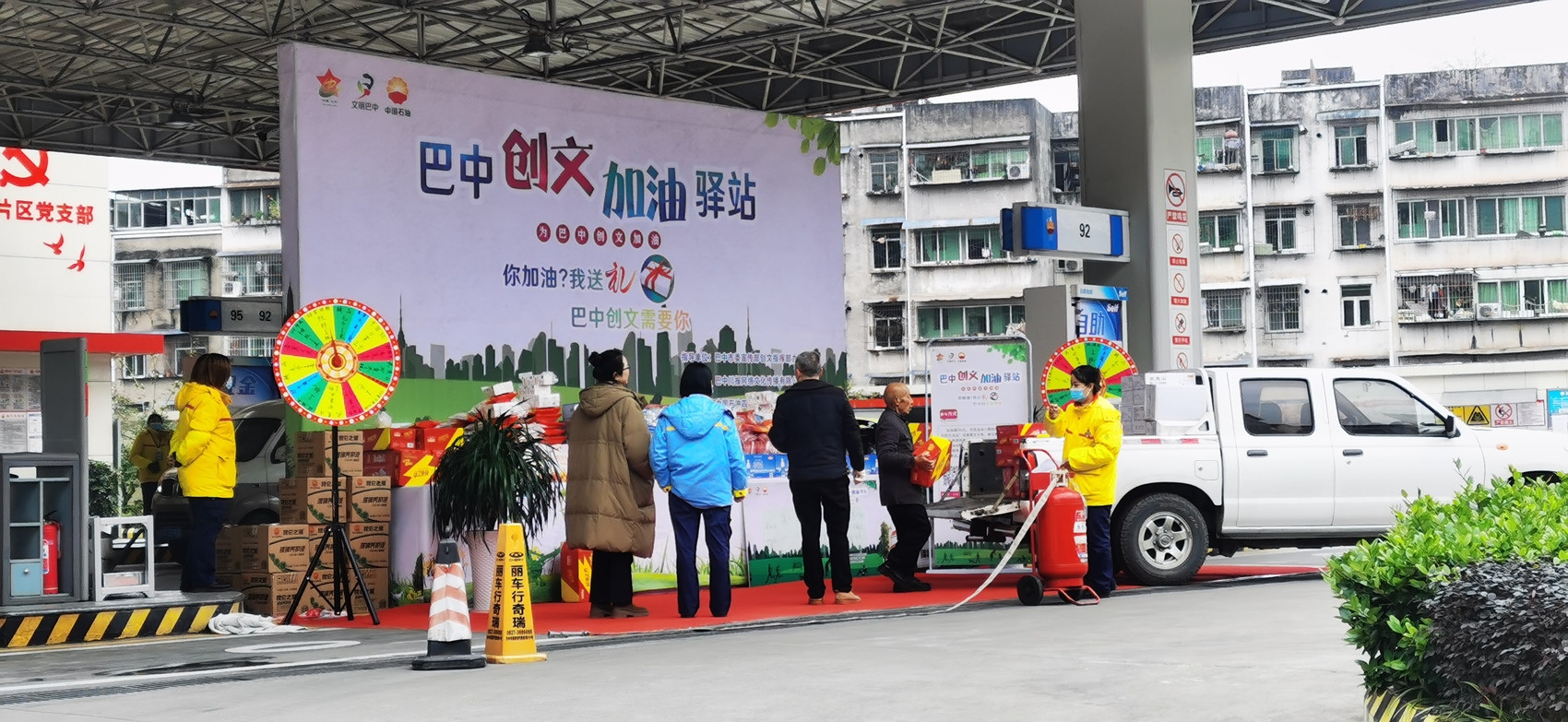为最大程度让活动深入群众中、将巴中创文传递出去,主办方与中国石油四川巴中销售分公司、社会爱心企业联动,设置了保温杯、绵柔毛巾、汽车香薰、翡翠米、功能饮料、抽纸等10余个品类,14000余个、总价值3万余元的奖品。只要车主在巴中中石油加油站加油满200元,微信扫码分享“我为巴中创文加油”创意图文到朋友圈,即可参与到有奖转盘活动,免费领取“创文”文创纪念品和加油站配套福利。