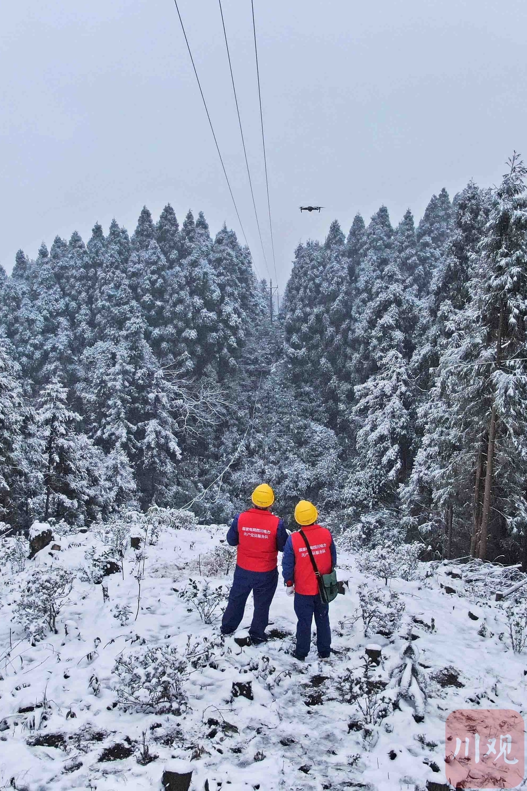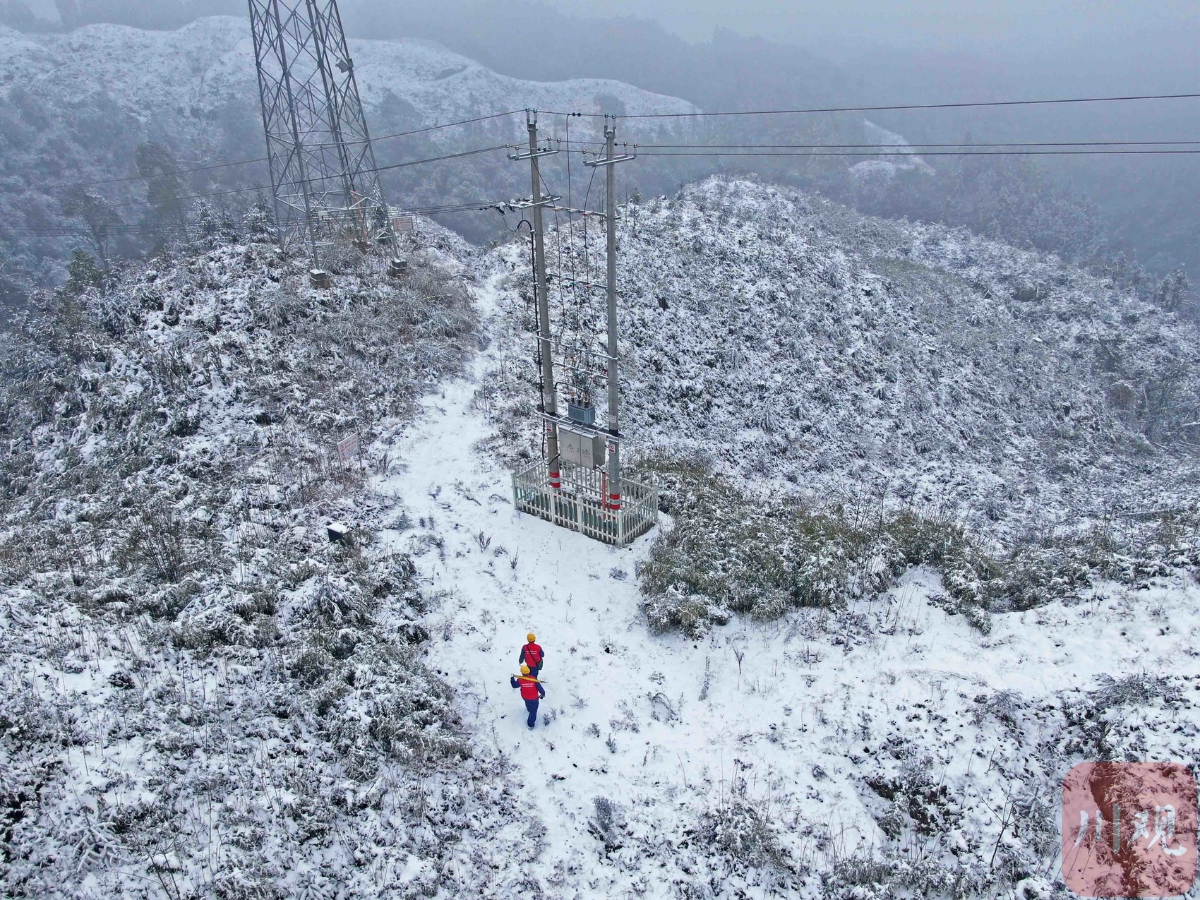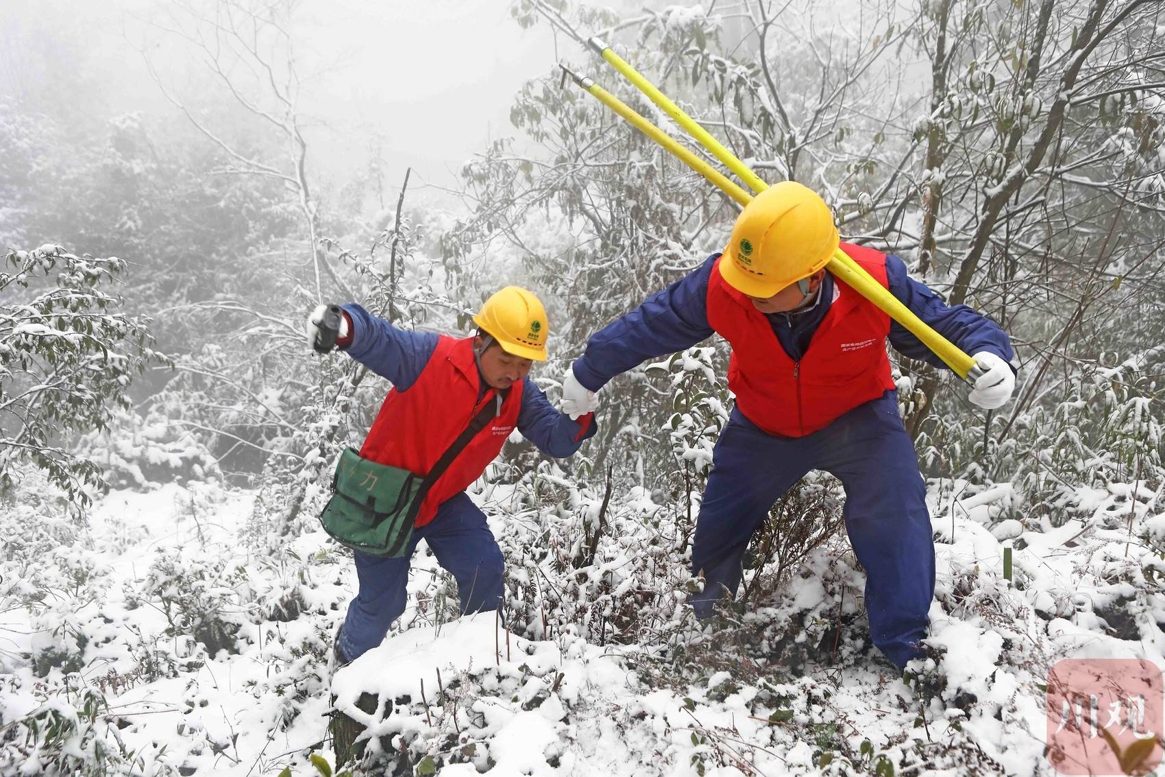 12月27日,眉山市洪雅县的玉屏山迎来大雪,国网眉山洪雅县供电公司柳江供电所的工作人员对10千伏柳镇线玉屏山支线开展雪后巡视。