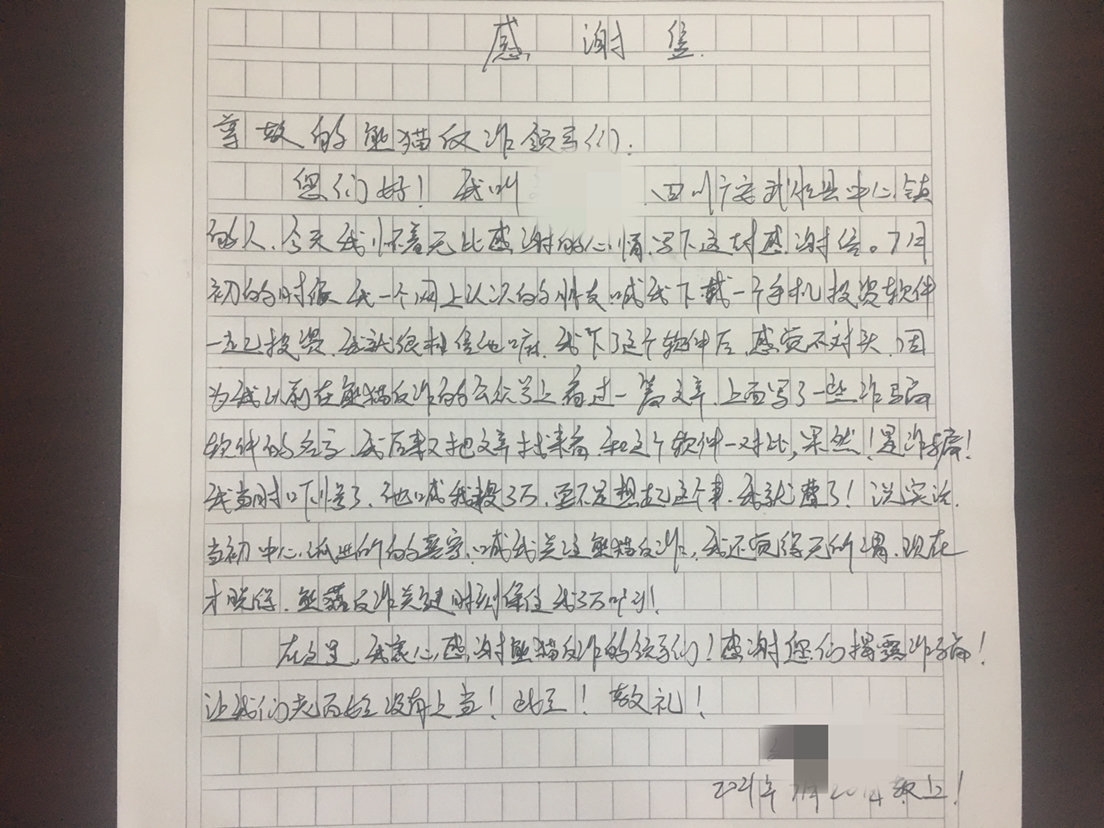 今年7月,达州宣汉市民王大姐遭遇电信网络诈骗,就在王大姐准备给骗子转账的时候,突然想起自己曾经在“熊猫反诈”公众号上看到过类似的诈骗手段,赶紧停止转账并到就近派出所报警。“当宣汉县公安局反诈民警告诉我们这件事,我们感到非常鼓舞,觉得自己的努力没有白费。”“熊猫反诈”微信公众号编辑、民警陈力说,平时大家经常会接到群众微信后台的各类咨询、求助留言都会尽力答复。今年以来,“熊猫反诈”已收到群众感谢信72封。
