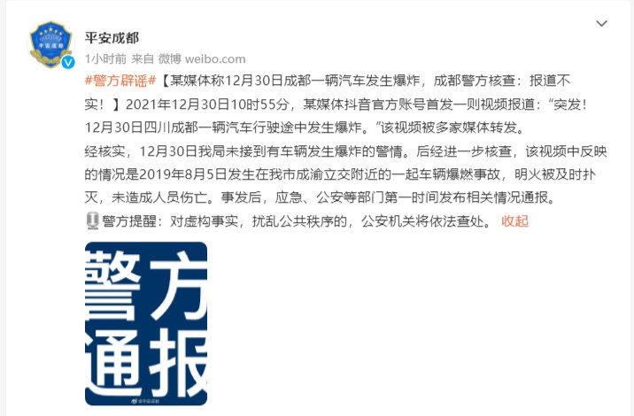 12月30日,成都市公安局发布辟谣消息。消息称,2021年12月30日10时55分,某媒体抖音官方账号首发一则视频报道:“突发!12月30日四川成都一辆汽车行驶途中发生爆炸。”该视频被多家媒体转发。