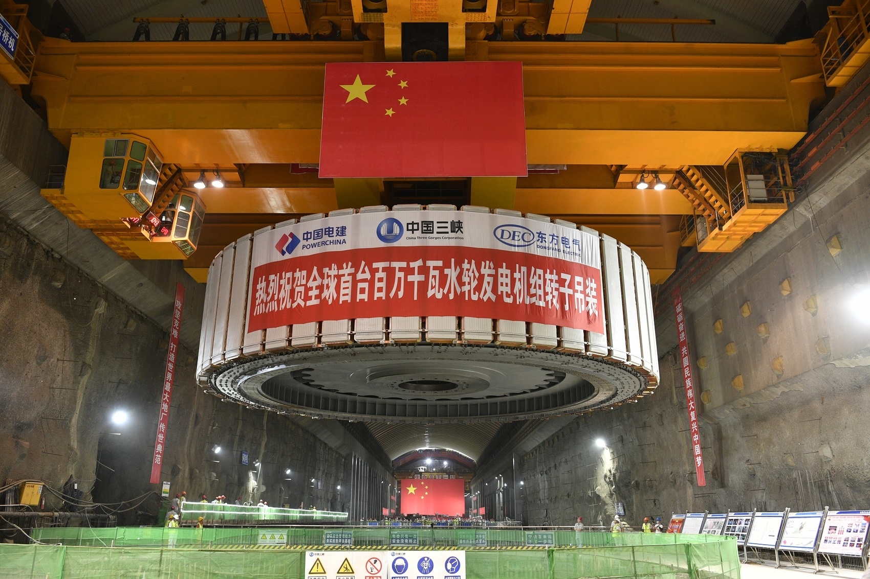东方电机自主研制全球首台百万千瓦水轮发电机组转子在白鹤滩水电站吊装