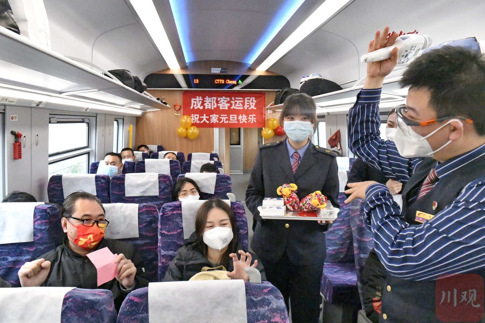 12月30日,在成都东开往广安南的C770次复兴号动车上,乘务员为旅客举办迎元旦联欢活动。