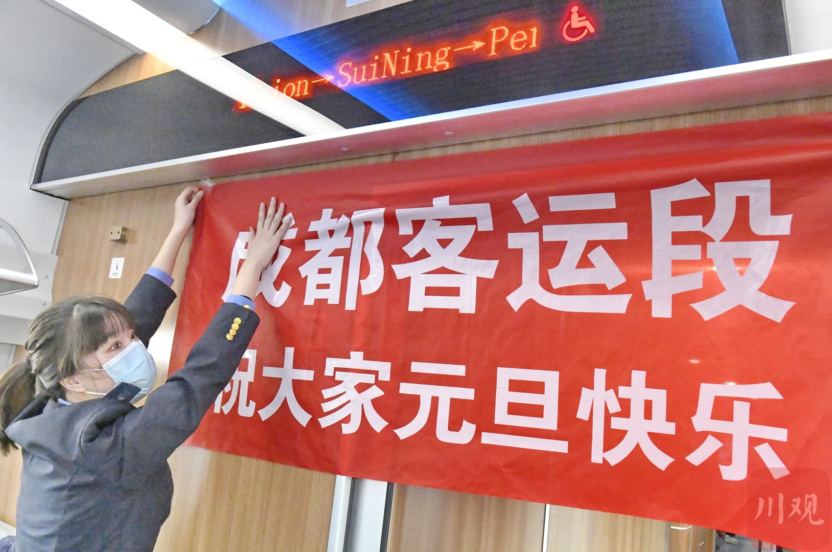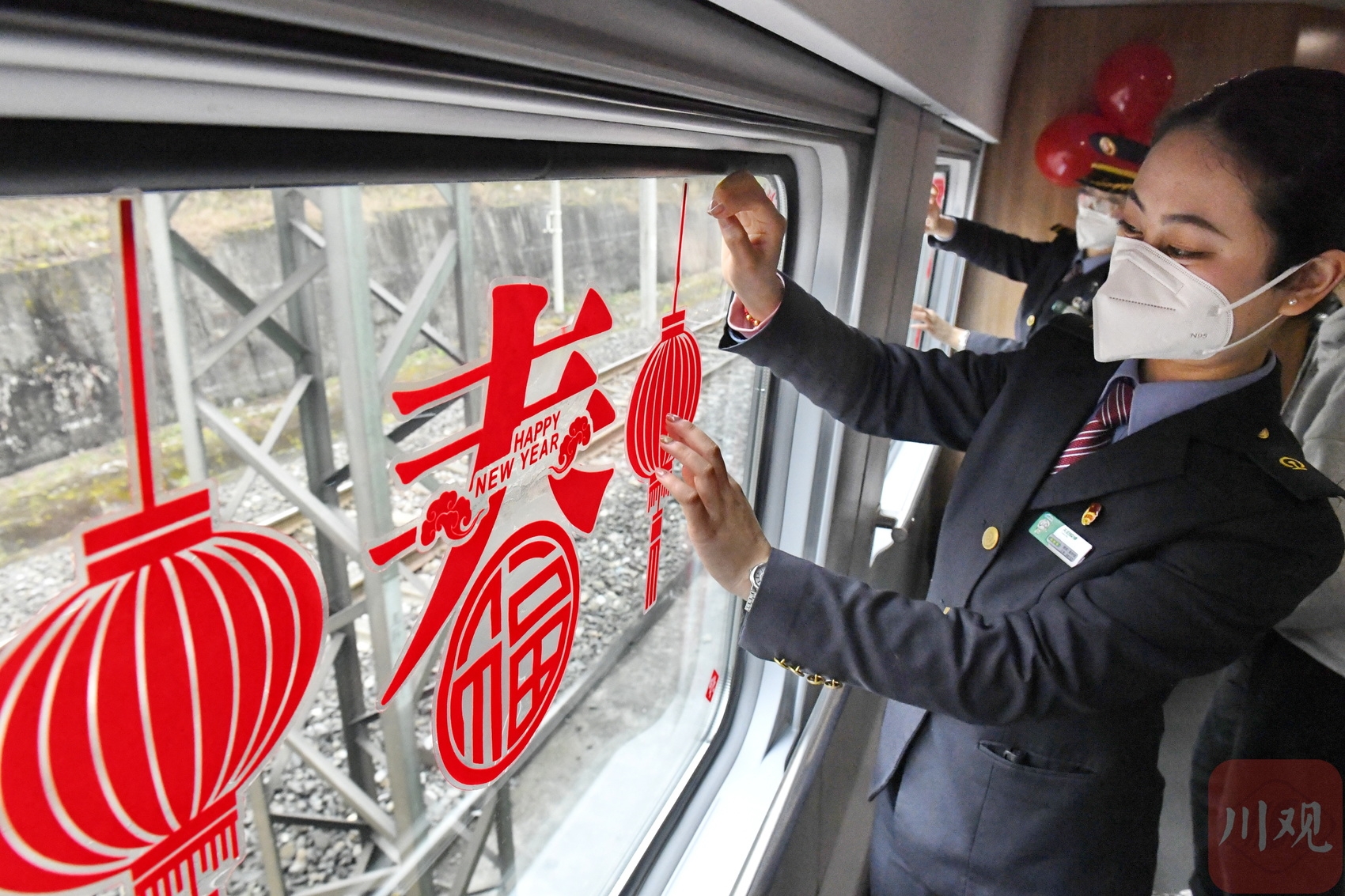 2021年12月30日,在成都东开往广安南的C770次列车上,为了让出行的旅客提前感受到元旦的气息和氛围,在这趟复兴号列车上,列车工作人员将车厢布置上满满的新年元素,开展了迎新年联欢活动,为旅客带来精彩节目与旅客一起迎接新年的到来。