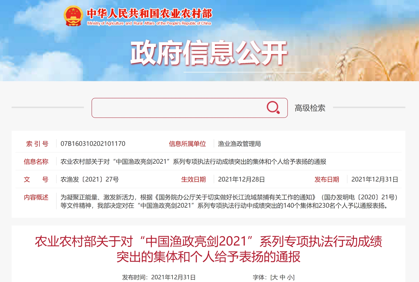 12月31日,四川在线记者从农业农村部官网获悉,农业农村部近日对“中国渔政亮剑2021”系列专项执法行动成绩突出的140个集体和230名个人给予了通报表扬。其中,四川4家单位和8名个人名列其中。