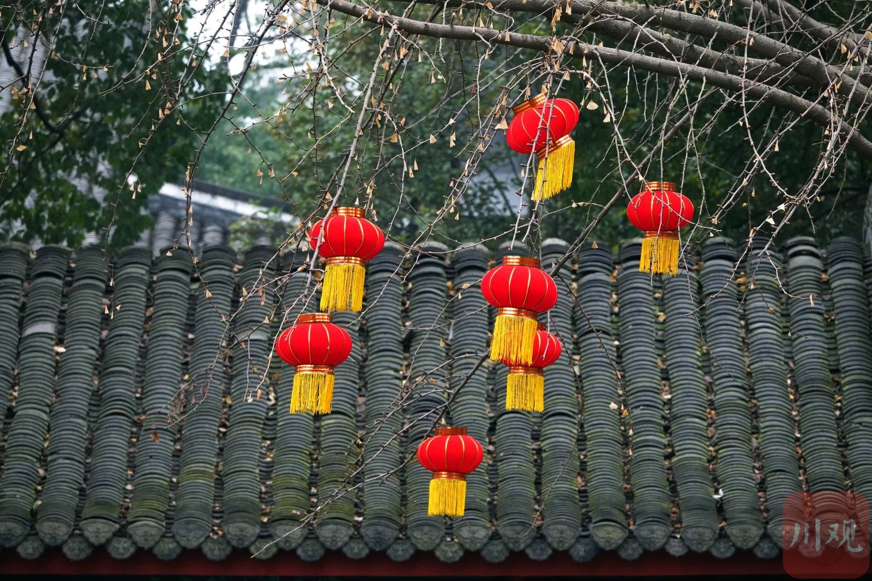 随着2022年的临近,成都各处公园也渐渐有了新年的氛围。百花潭公园主要道路的行道树上,工人们正在加班加点悬挂灯笼,增添节日喜庆气氛。