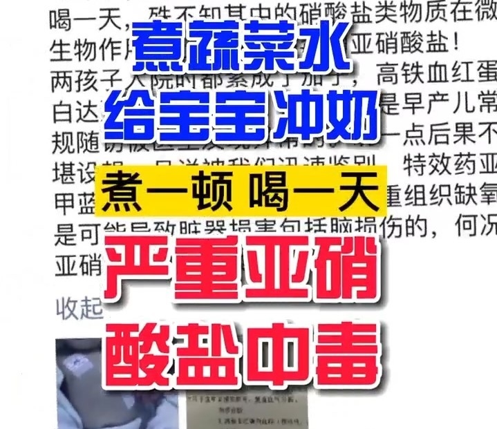 9月29日,川观拍客了解到成都市妇女儿童中心医院新生儿科在一个月内收治了两名严重亚硝酸盐中毒的新生儿,皆因家属觉得奶粉会“上火”,用熬煮的蔬菜水为宝宝冲奶。煮一顿,喝一天,殊不知其中的硝酸盐类物质在微生物作用下还原成了剧毒的亚硝酸盐!