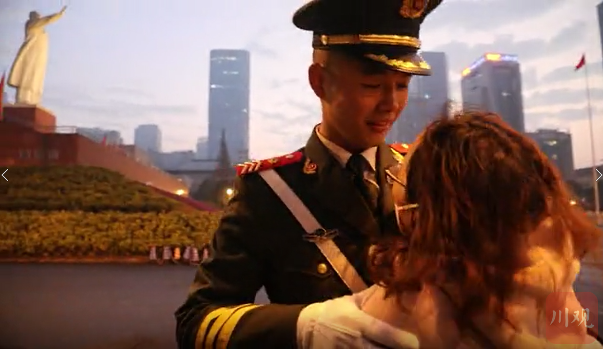 元旦天府广场升国旗仪式结束后,武警四川省总队成都支队“蓉城国旗护卫队”队员马致远见到久别的妈妈。