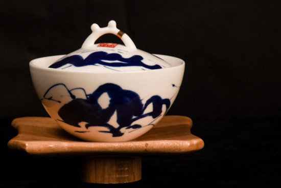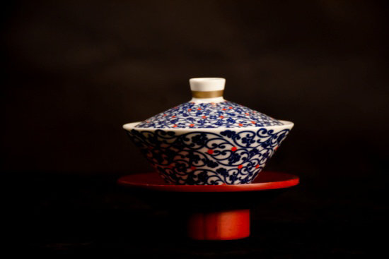 斗笠盖碗:茶盖镶嵌金属装饰,在传统青花基础上拥有现代感、时尚感。同时,青花红心,与茶船呼应,颜色统一完整。茶碗直线延伸设计,使之相较其他盖碗设计更加硬朗,茶船回归唐代木质材料,采用圆弧柔和碗身。