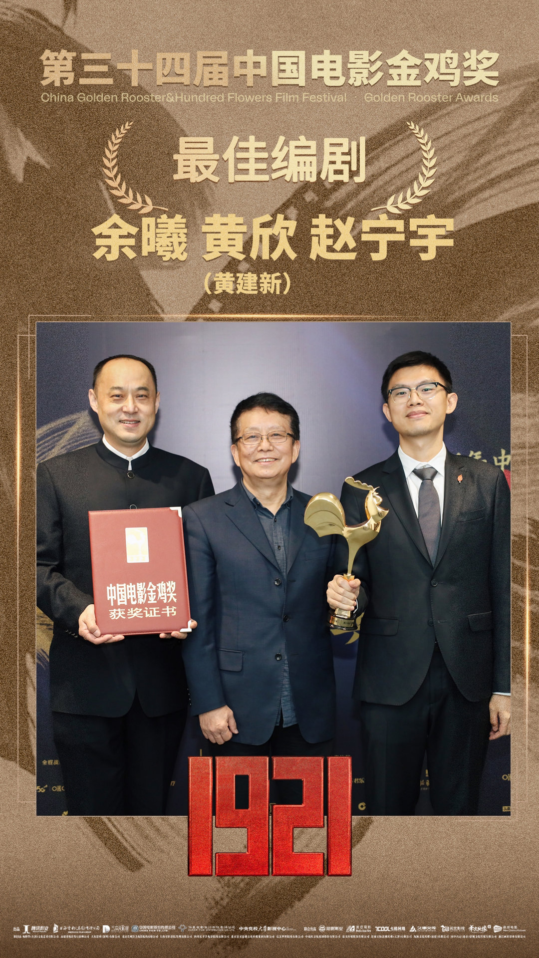 日前,第34届中国电影金鸡奖颁奖典礼举行,余曦、黄欣(黄建新)、赵宁宇《1921》(原创)获最佳编剧奖。此前,影片在第16届中国长春电影节上也荣获“金鹿奖”最佳编剧奖。
