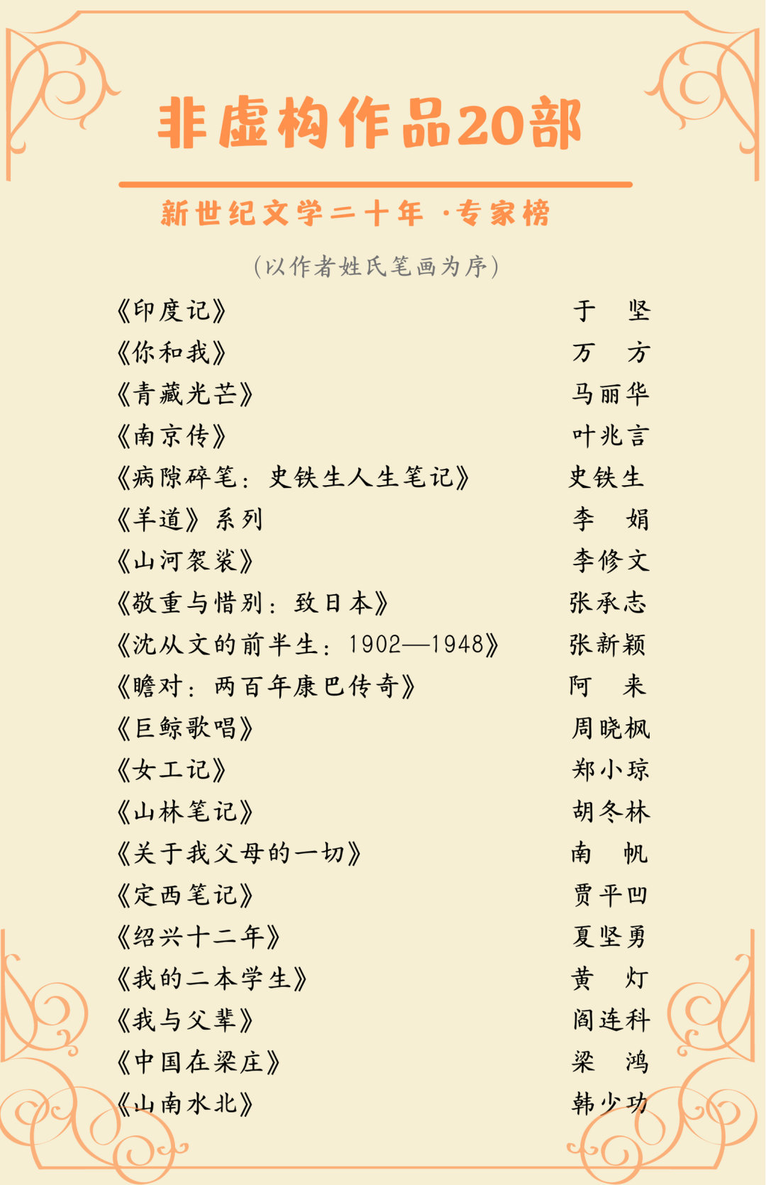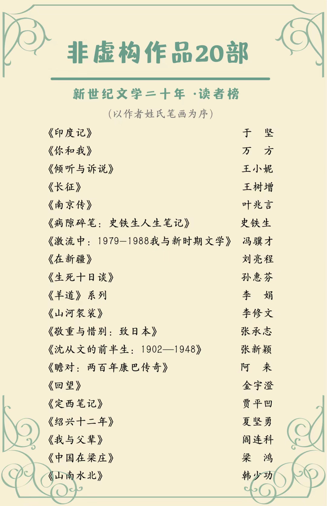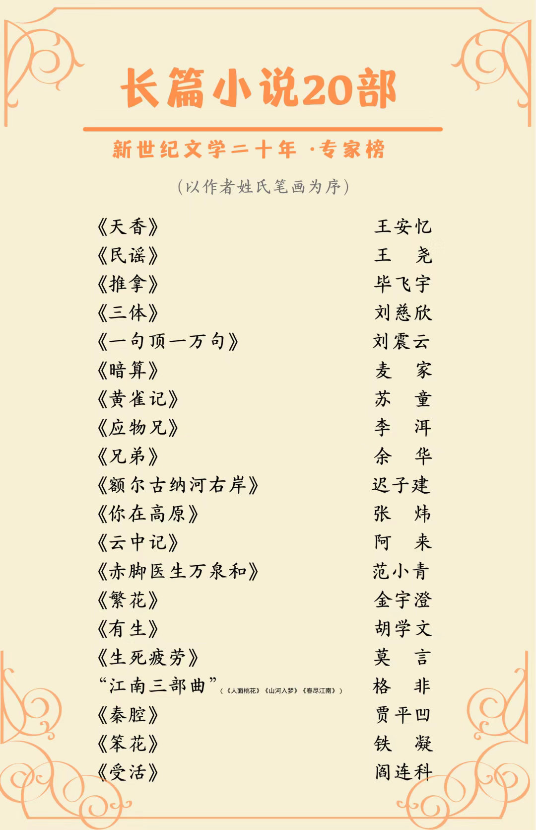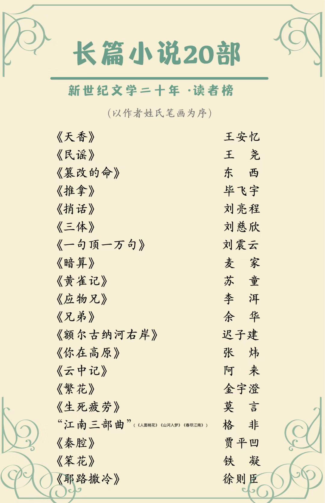 最终,经过数十位批评家、作家、编辑、出版人等专家的提名,又有十多位文学界著名专家的终评,历时两个多月的酝酿考量,这一颇具分量的榜单正式揭晓——新世纪文学二十年里1970年后出生的创作成绩最为突出的20位青年作家、20位青年诗人,2000年之后首次发表或者出版的20部长篇小说及20部非虚构文学作品榜上有名。