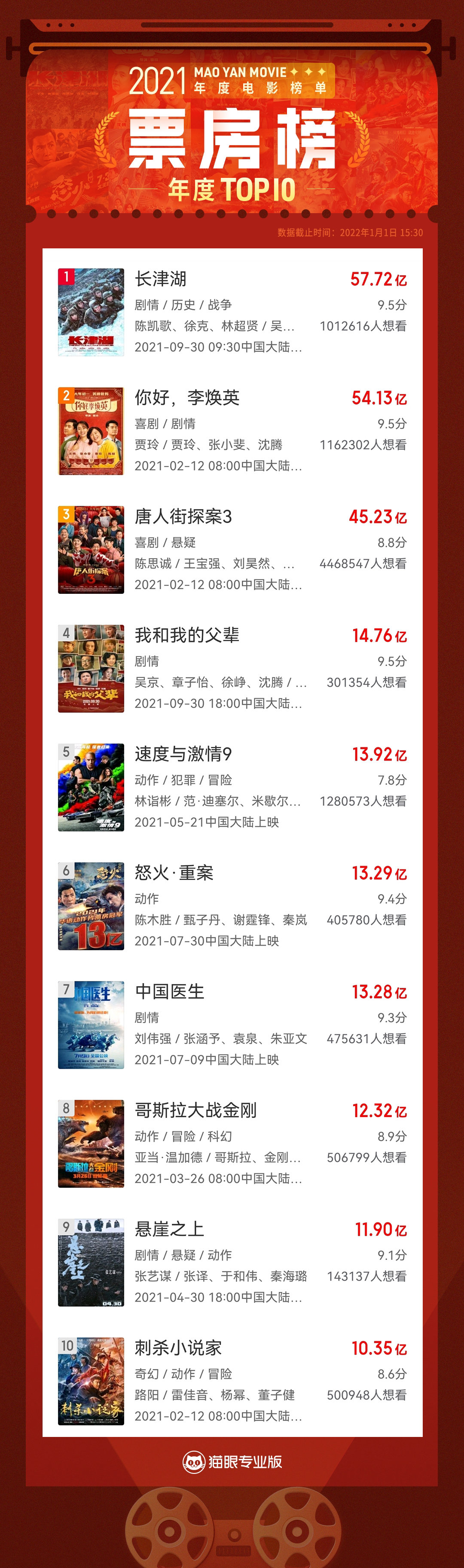 2022年1月1日,猫眼研究院发布《2021中国电影市场数据洞察》,从市场大盘、档期特点、观众观影意愿和动机、国产电影类型等多维度对2021年的中国电影市场进行了盘点回顾。2021年,中国电影市场票房472.58亿,继续保持全球冠军。