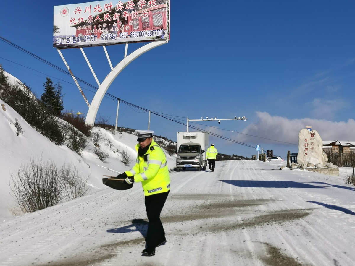 升国旗的同时,红原县公安局交警大队大队长索郎泽让已经带领17名民辅警在该县龙日镇G248线查针梁子保畅值班。漫天风雪中,他们不但认真疏导过往车辆,还不时为抛锚车辆脱困施以援手,很多民辅警成了移动的雪人。